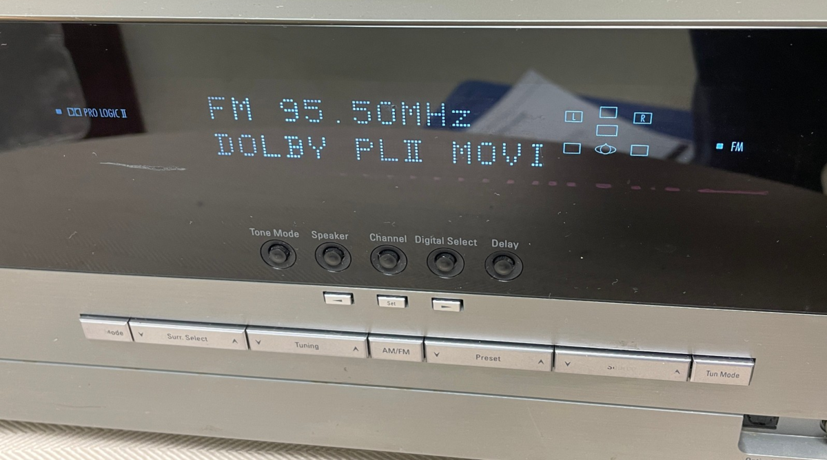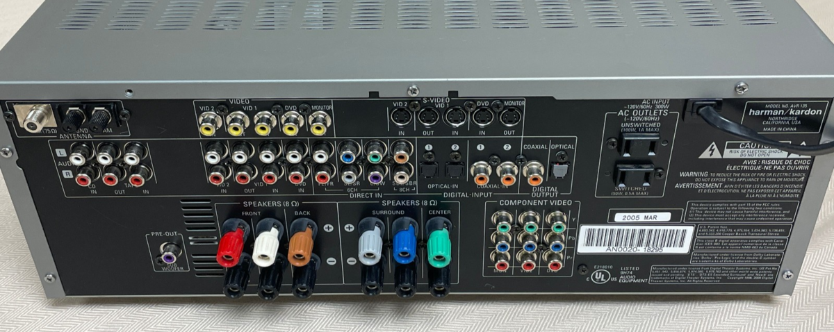 Used Dolby 5.1 Receiver with 50watts a channel in Stereo mode and 40 watts a channel to the Surrounds. Connect 8 Ohm Speakers only to this receiver. This does Composite and Component video only NO HDMI