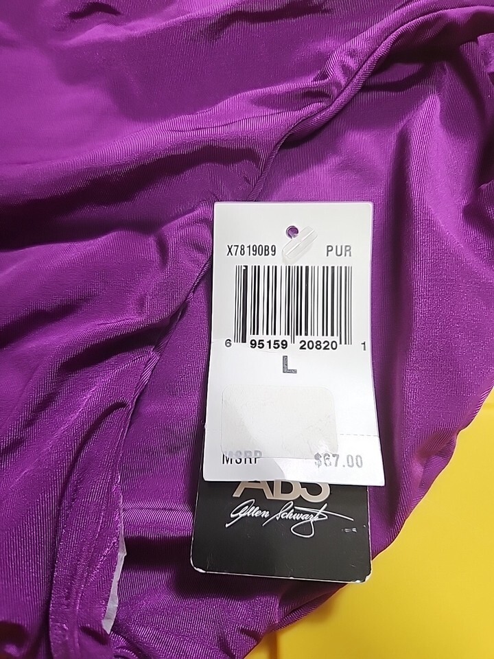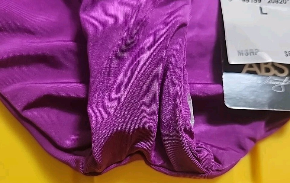 This NWT ABS bikini bottom in size Large features a beautiful purple color with a charming bow accent. The lightweight and stretchy material made of nylon and spandex ensures a comfortable fit for any swim activity. The bikini bottom style is perfect for any beach or pool day, and the solid pattern adds a touch of elegance to this colorful piece. MSRP $67.