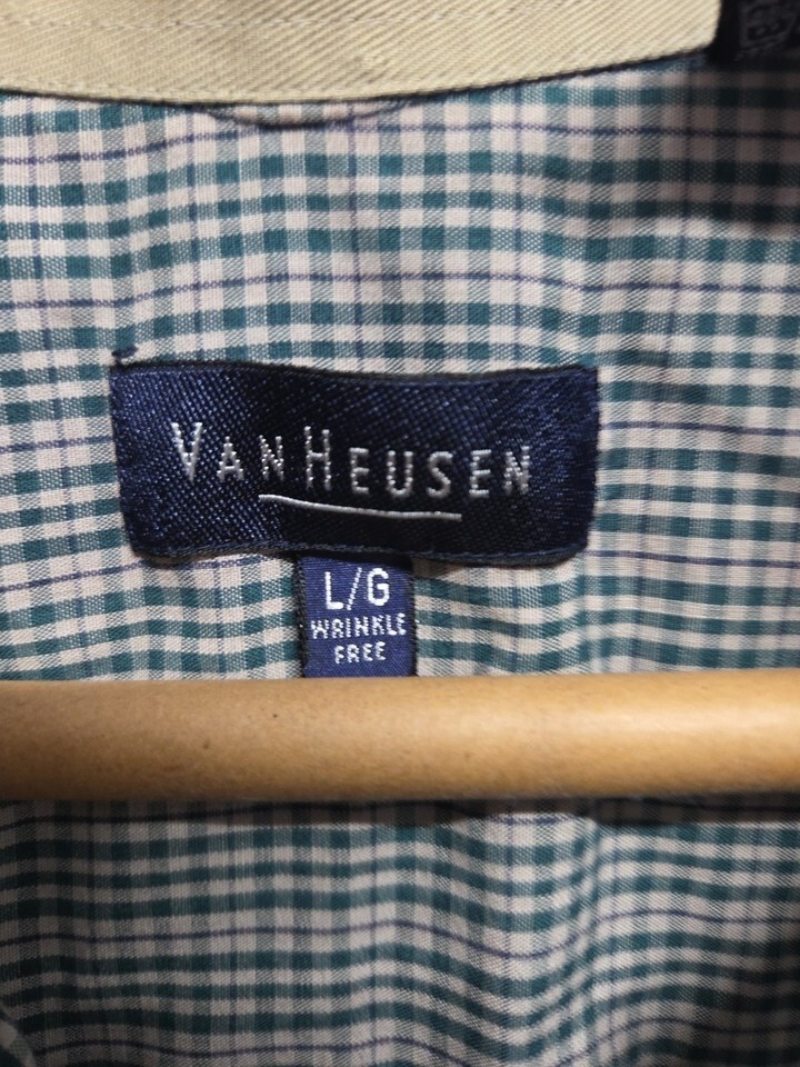 The product is a Van Heusen men's short sleeve plaid green button-up shirt, perfect for casual or travel occasions. Made from a blend of polyester and cotton, this lightweight woven shirt features a classic 90s, grunge, and preppy style with a button-down collar and regular fit. It comes in size L and has accents like buttons and pockets, making it versatile for all seasons. The shirt is a timeless piece that can be styled in various ways to suit different outfits and themes, making it a great addition to any man's wardrobe.