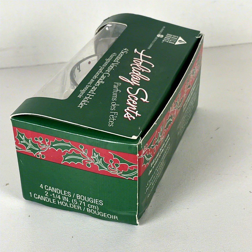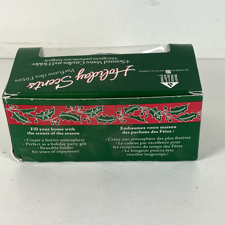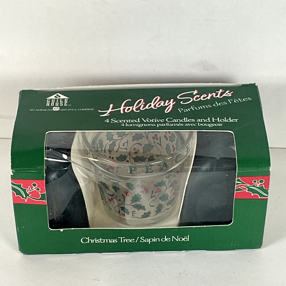 Experience the festive charm of the holiday season with this Guild House Holiday Scents set featuring 4 scented votive candles and a decorative glass holder. The elegant jar holder is beautifully adorned with a classic Christmas Tree design of holly leaves and berries, creating a warm and inviting atmosphere perfect for any holiday gathering or cozy night in. The set includes four 2-1/4 inch dark green votive candles that fill your home with the delightful scent of Christmas Tree, evoking memories of fresh pine and festive celebrations.