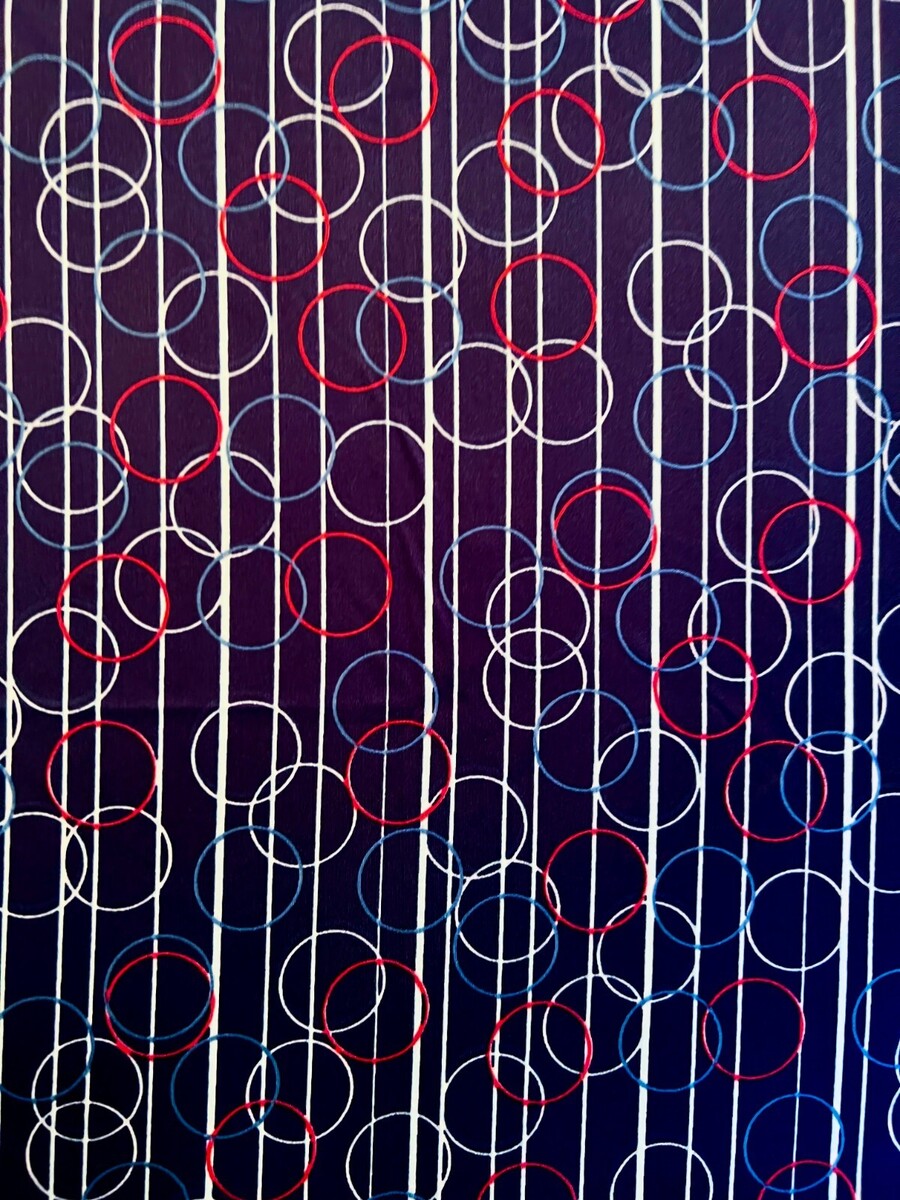1970s Mod VTG Polyester Knit Fabric Red White Blue - 84Lx65W" Unused Yardage with circles or bubbles on stripes.