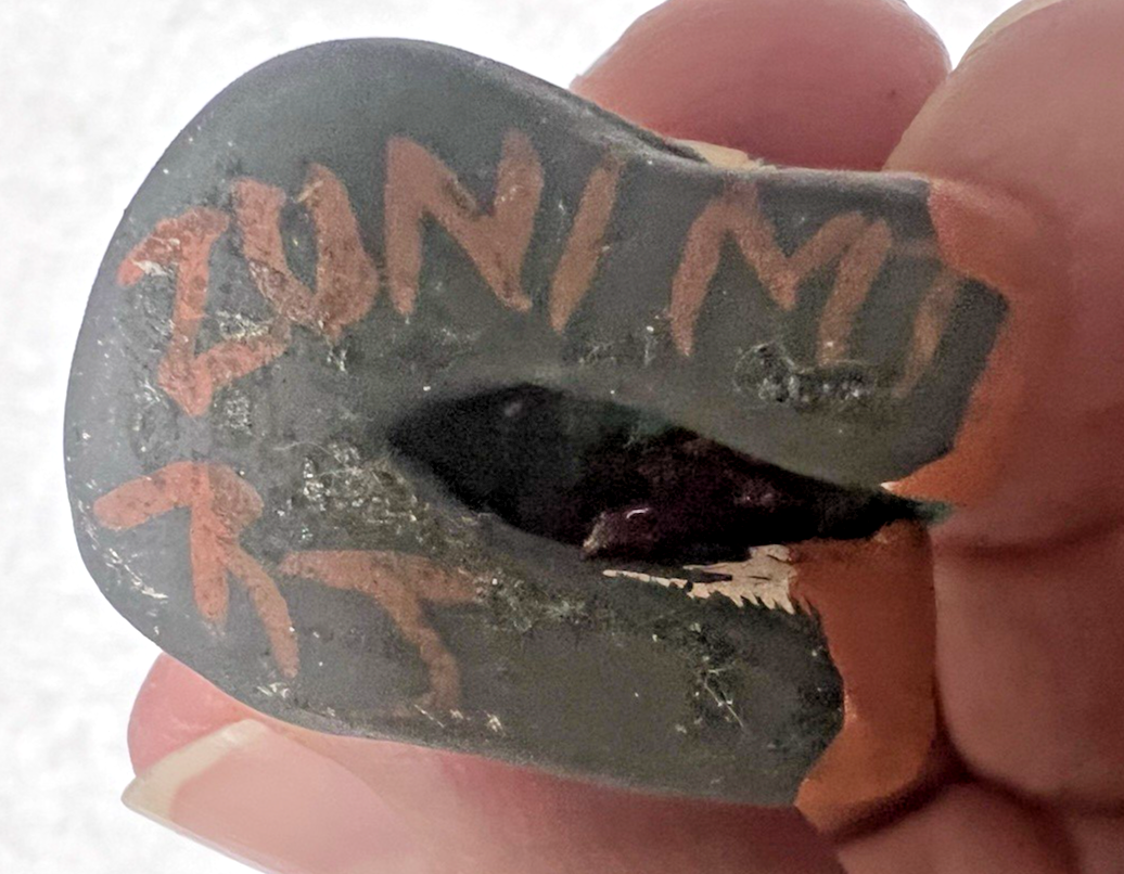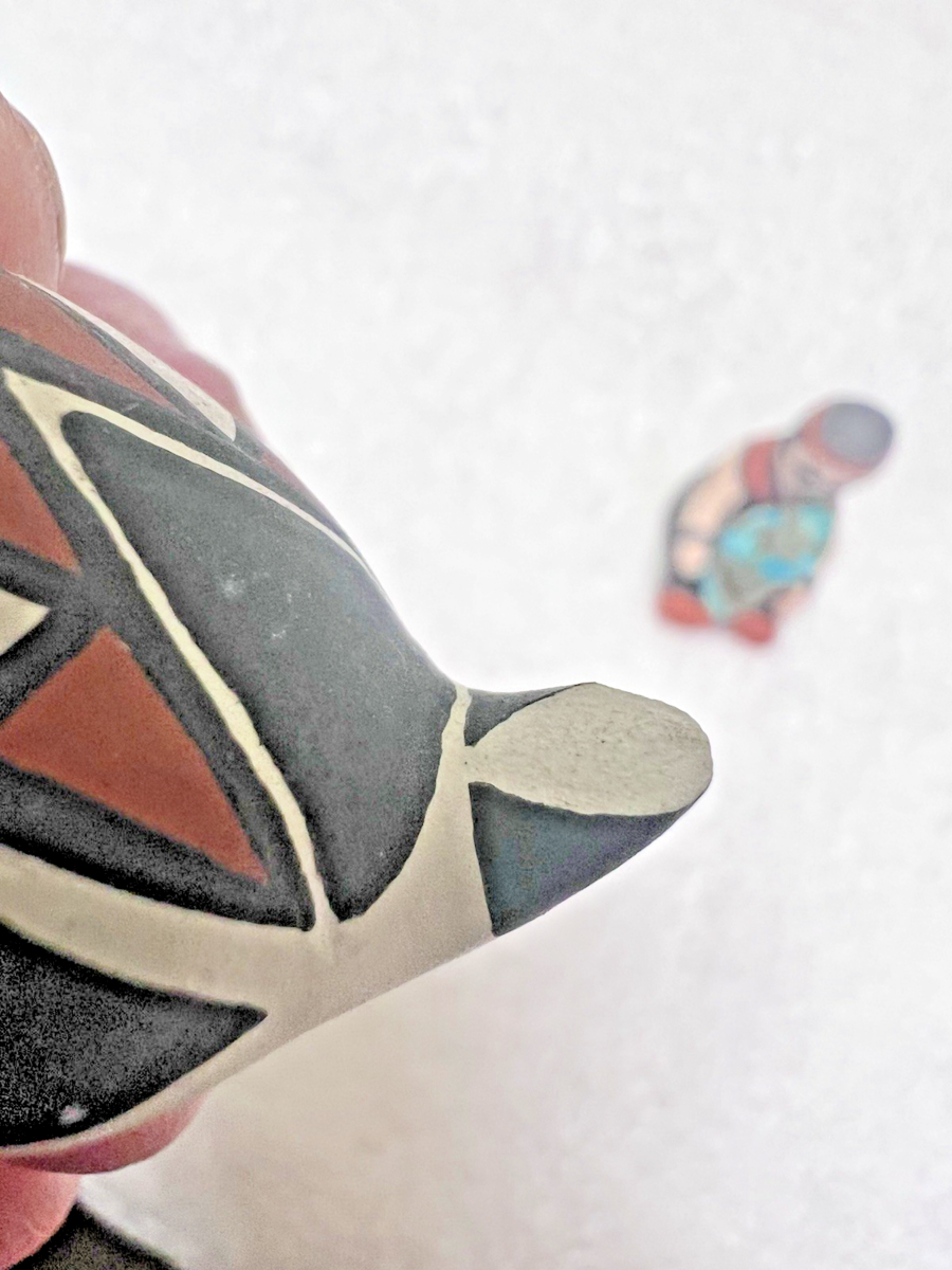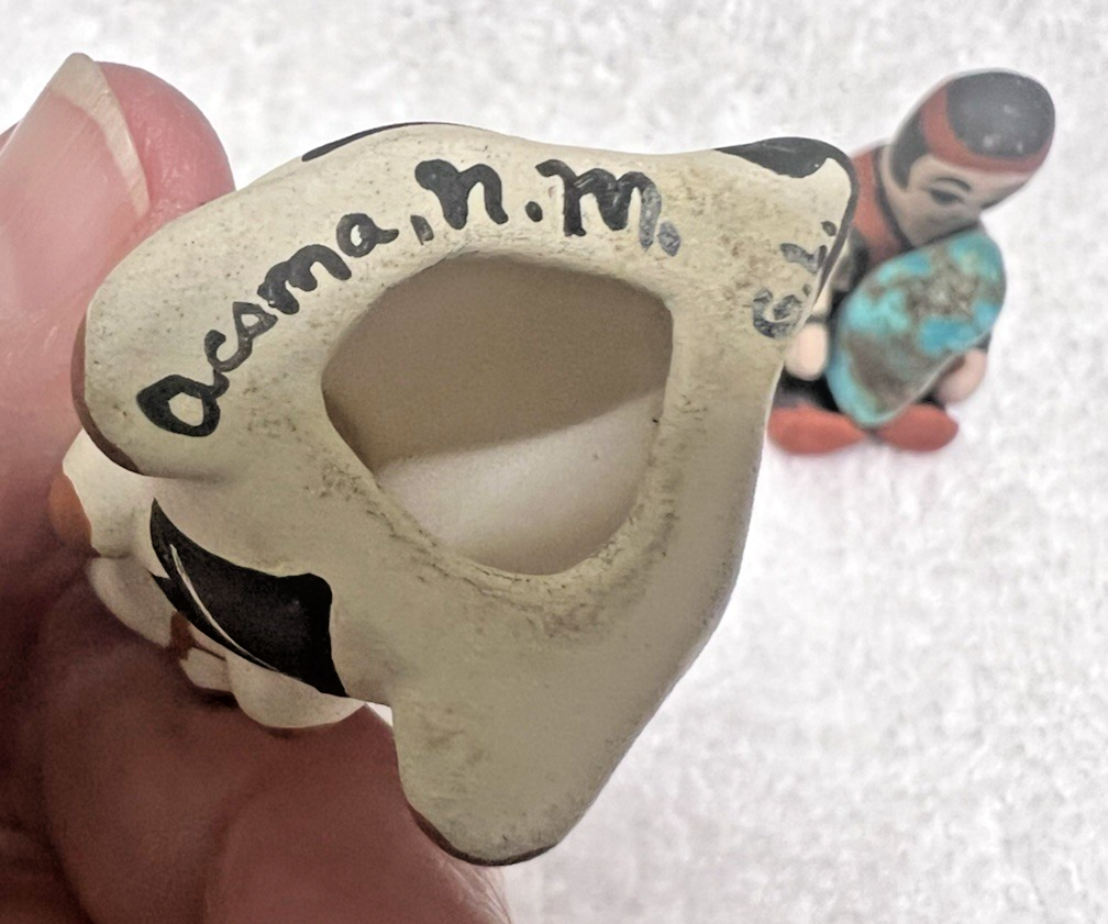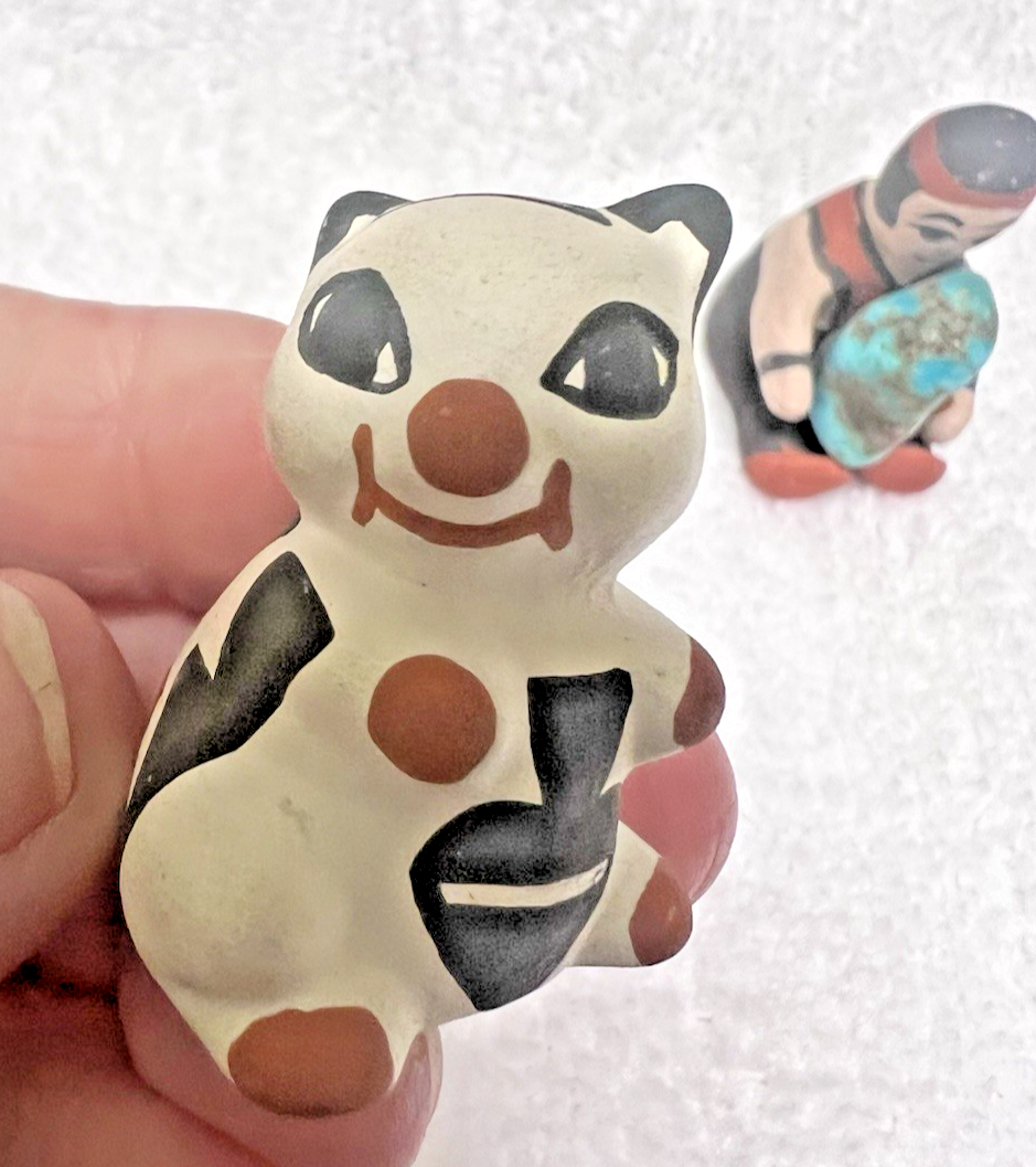 2 Tiny Native American Story Teller w Piece of Turquois Stone Critter ok the critter is signed Acama NM I think ? also see the tail it has a chip we have a photo1 3/8 inches tall. The man 1.5 tall x 3/4 wide signed Zunimt? ok this is not my wheelhouse so please ask if you have questions before you purchase we will try and answer any and all questions
