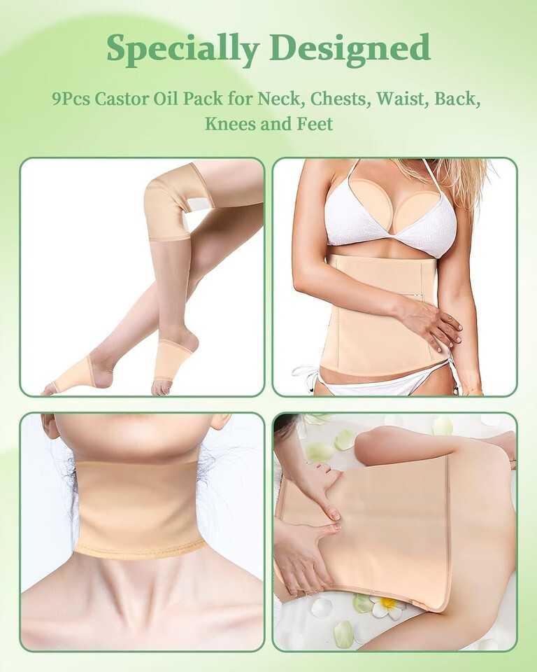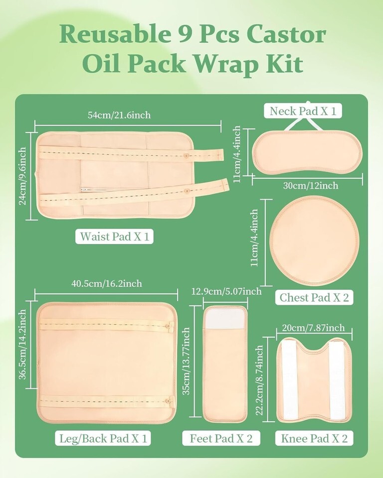 ??Our castor oil pack kit contain 1 castor oil wrap for neck, 1 castor oil pack for waist, 2 castor oil packs for chest, 2 castor oil wraps for knee, 1 castor oil pack for back/leg and 2 castor oil packs for feet. Castor oil pack can also be used on thighs, calves, arm joints, ankles, soles, etc. Castor oil pack kit is a complete combination for entire body, provide a full range of care for your whole body(Oil Not Included).