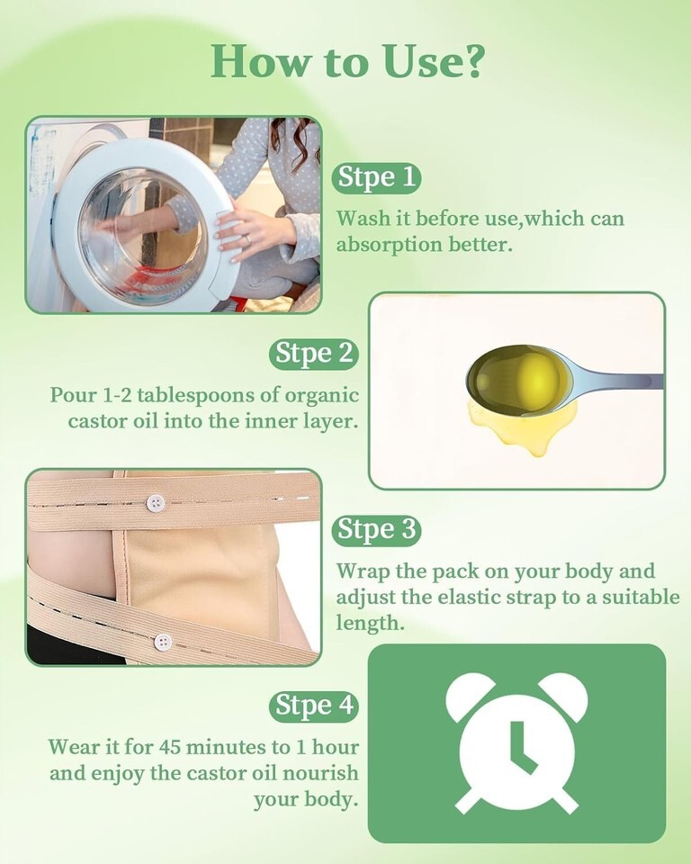 ?Castor Oil Wraps Easy to Use and Reusable?We suggest applying 1-2 tablespoons castor oil to the inner layer of castor oil packs, pay attention to avoid the edges and wear caster oil pack about 1 hour, You can walk around with castor oil wraps pack and carry out other tasks without losing your precious time. Reusable castor oil packs are durable and can be washed many times, sturdy and easy to use for a long time. Store castor oil in a cool, dry place. Note: Forbidden for pregnant women.