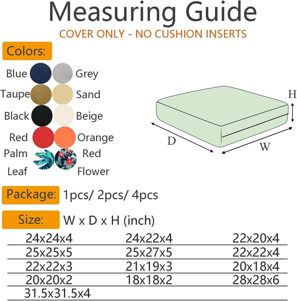 20X20X2 Inches in Blue, ONLY COVERS: 4 Packs outdoor seat cushion covers with bright and captivating fashion-forward look that Fits Most Deep Seat Cushions and Backs for Chairs, Love Seats or Sofas with Individual Cushions. NOTE: Please double measure your cushion size before purchasing.