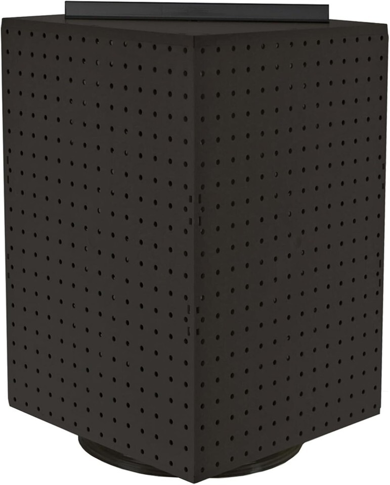 DIMENSIONS - This 4-sided interlocking rotating rack pegboard tower measures 14 inch W x 14 inch D x 20 inch H. Assembled height is 21 inch. The product display stands on a revolving base that is 12-inch diameter