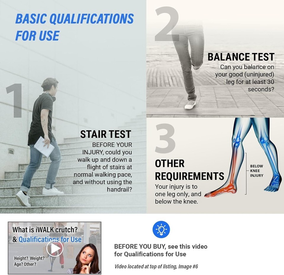 DESIGNED FOR BELOW-THE-KNEE INJURIES: the iWALK crutch works for below-the-knee injuries ONLY. Review the Qualifications for Use to confirm that the iWALK knee crutch will work for you.
