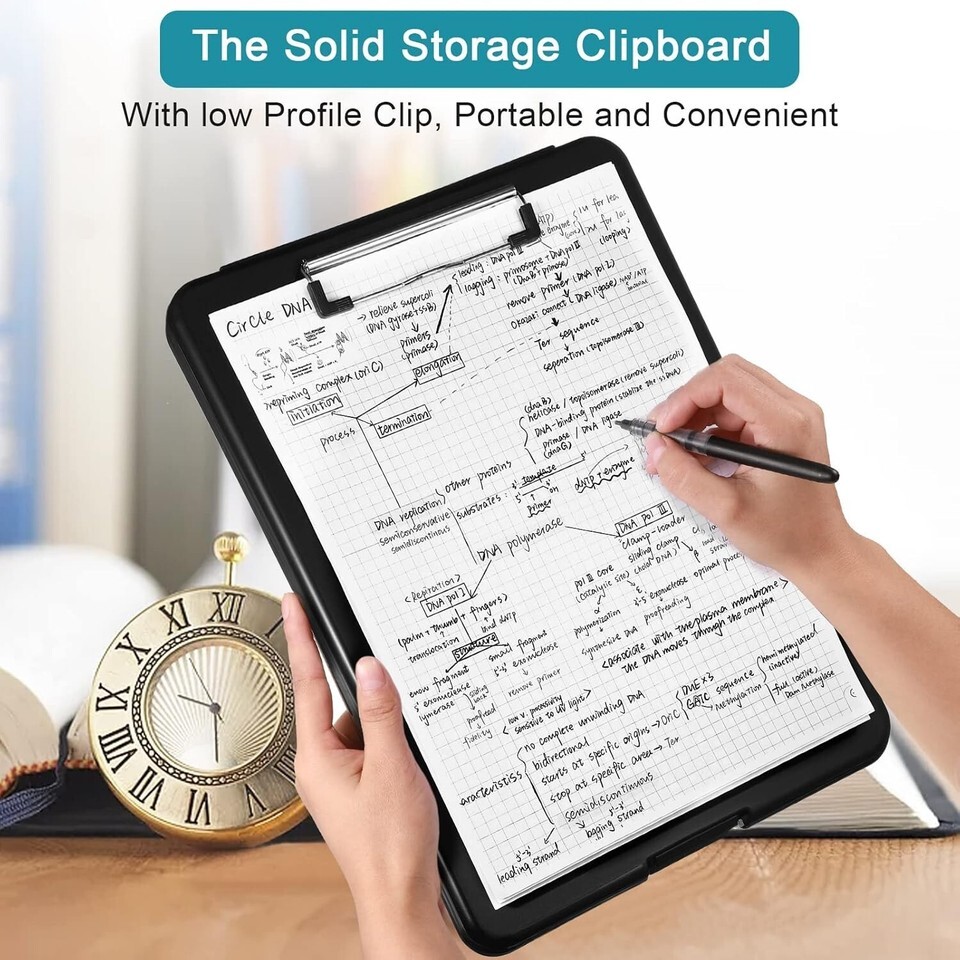 Sturdy and Compact: the plastic storage clipboards compartment is made of quality polypropylene (PP) plastic material, which is sturdy, water proof and not easy to break; The metal low profile clip is also strong enough for long term use