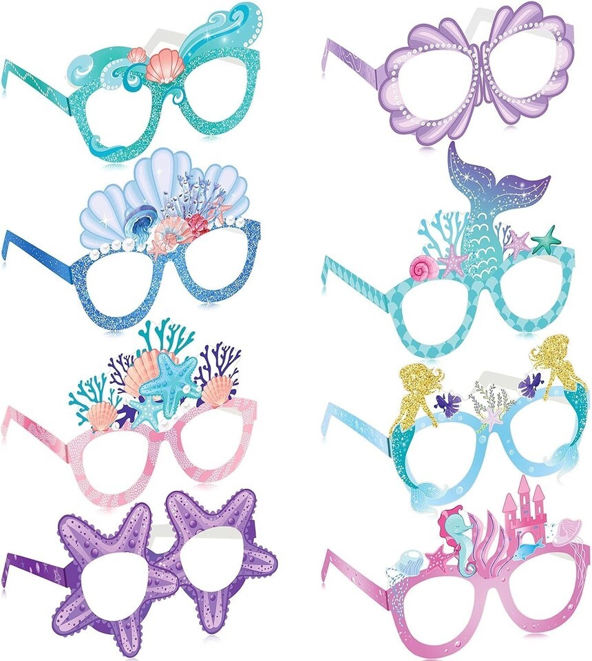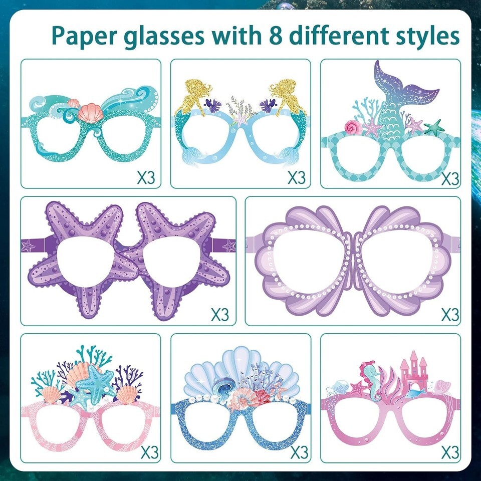 Includes 24 pieces of mermaid themed paper eyeglasses in 8 different patterns