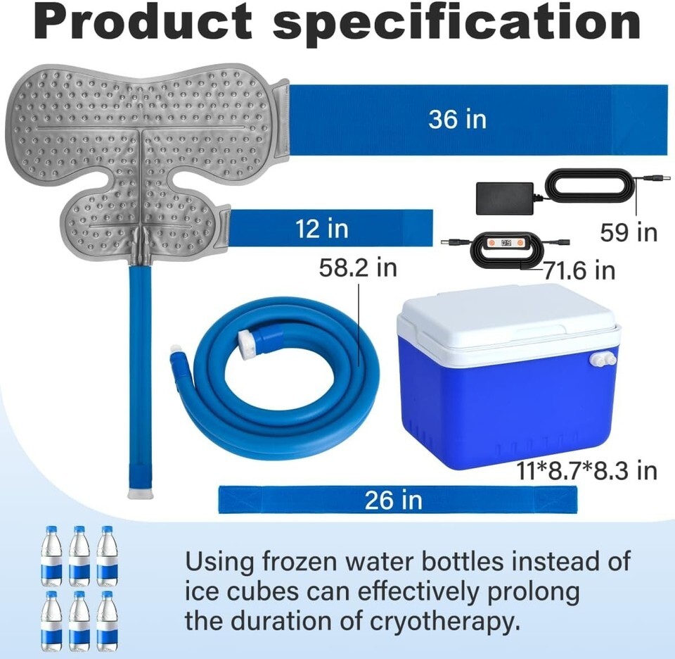 Features: Reusable,Leakproof,Easy to attach,Professional-grade,Quick-connect buckles,Extended cryotherapy duration,Flexible,Ergonomic design,Recommended water-to-ice ratio,Adjustable,Compact