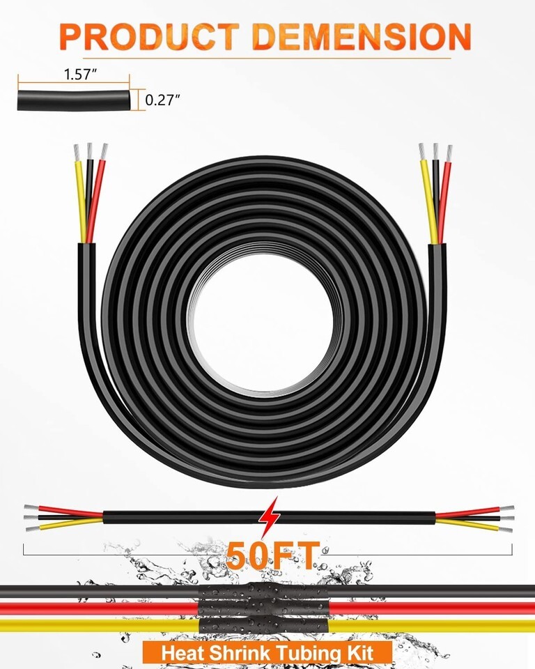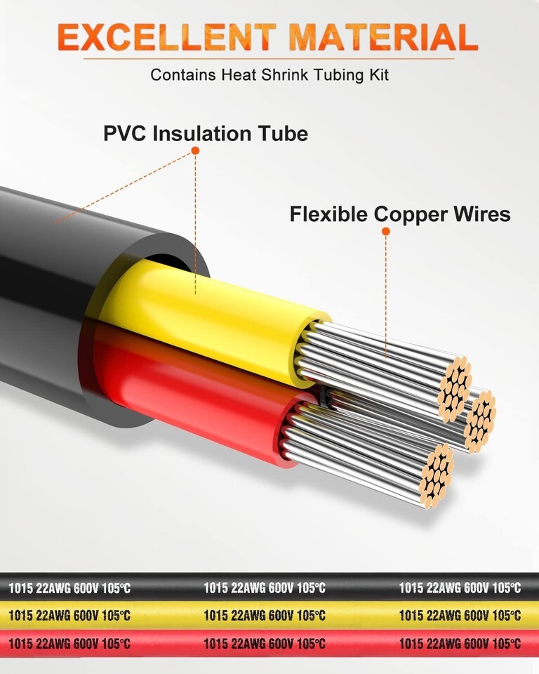 ??BUILT TO LAST?3 Conductor 22 gauge wire is insulated/jacketed with high quality PVC, excellent chemical and oxidation resistance, and 28 packs of heat-shrinkable tubes 10 packs of cable ties. These tubes can Protect wires and cables from damage caused by wear and tear, abrasion, and moisture.