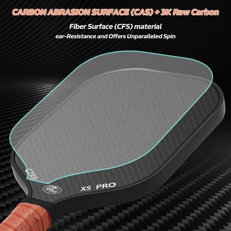?CARBON ABRASION SURFACE (CAS)? Advanced Based CARBON ABRASION SURFACE (CAS) + 3K Raw Carbon Fiber Surface (CFS) material, increases its friction, and prolongs the residence time of the pickleball on the racket face, harnessing the raw power with maximum spin ball control.