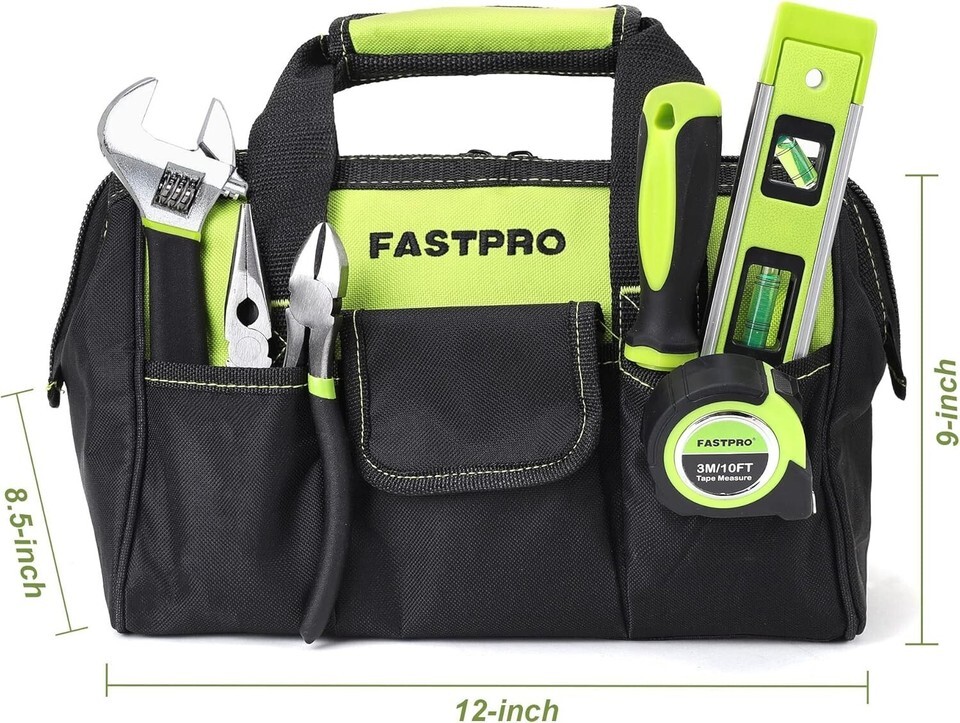Durable 12-inch tool bag is constructed by 600D polyester fabric for durability, wide-open mouth for easy approach to the tools. 6 pockets outside and 6 pockets inside for well organization.