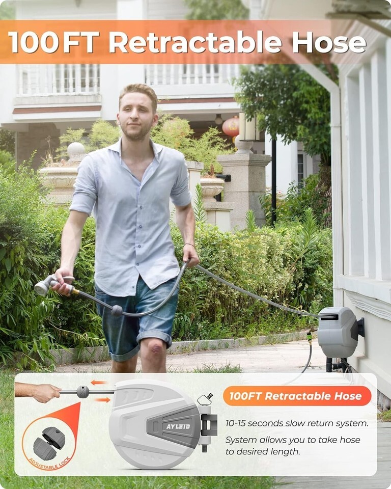 ??Free Lock?When you pull the hose to the length you need, it will automatically lock the position to stop the hose from retracting, and there is no extra length to bring kinks and tangles, so it is more convenient to use water.