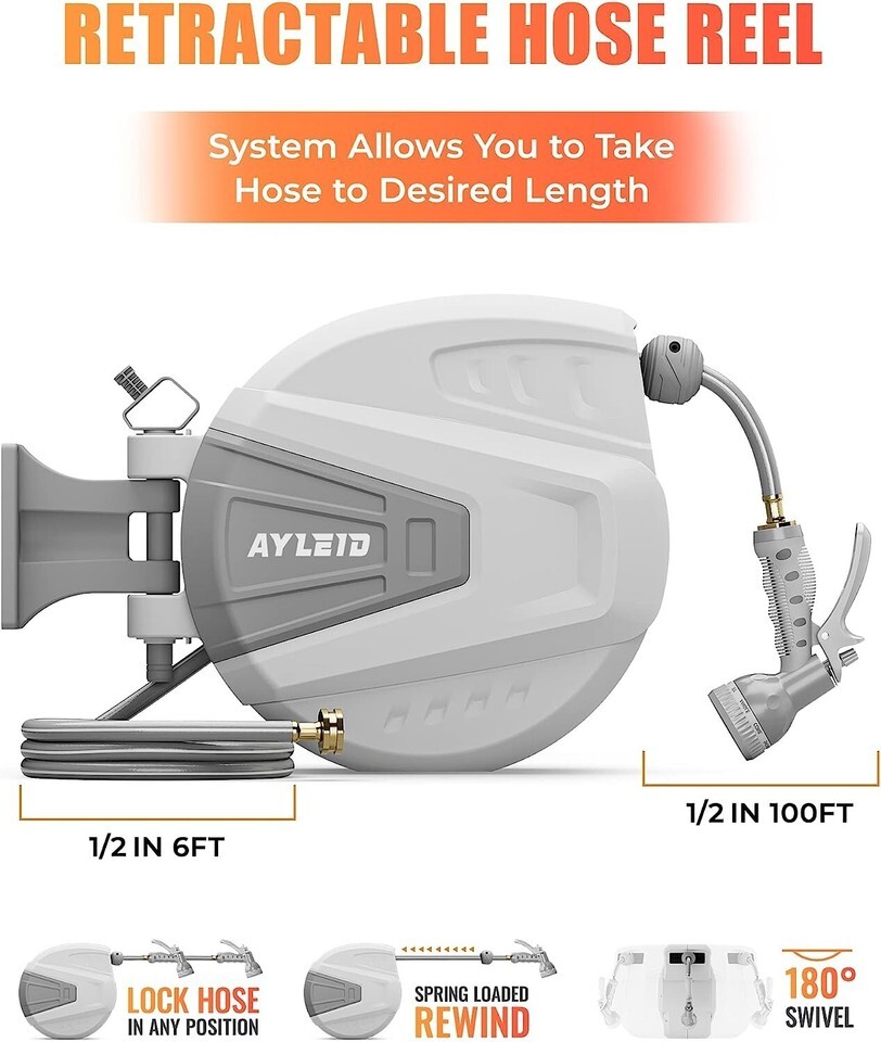 Retractable Garden Hose Reel,1/2 in x 100 ft Wall Mounted Hose Reel, with 9- Function Sprayer Nozzle, Any Length Lock/Slow Return System/Wall Mounted/180Swivel Bracket Grey