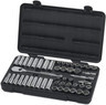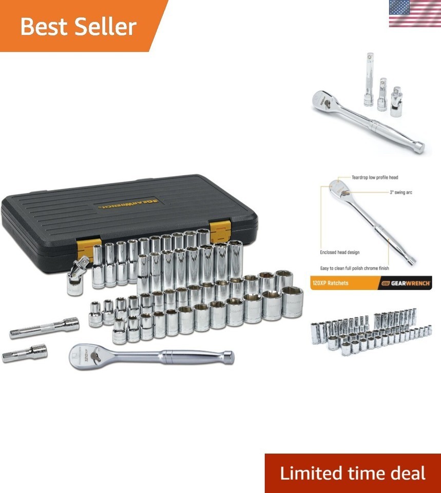 The 49-Piece Gear Wrench 120XP 1/2-Inch SAE and Metric Drive Set takes access to the next level, making it easier and quicker to complete jobs. The Double-Stacked Pawl design delivers 120 Positions, exceeds ASME torque performance requirements and gives easy access to fasteners, delivering extreme Productivity. This set includes both Standard and Deep 6pt Sockets from 7/16-Inch thru 1-1/8-Inch and 10mm thru 24mm, universal joint, 3-Inch 5-Inch extensions and 120XP 1/2-Inch ratchet. All conveniently organized in a portable and durable blow mold case with removable lid for storage in your tool chest. .com Delivering speed, strength, and access, the 49-piece socket set includes a wide variety of SAE and metric sockets as well as a 1/2-inch 120XP ratchet, which delivers 120 positions in 360 degrees for an ultra-narrow 3-degrees swing arc that turns bolts where others can't. This set includes both standard and deep 6pt sockets from 7/16-inch through 1-1/8-inch and 10mm through 24mm, a universal joint, and 3-inch and 5-inch 120XP ratchet's Double-Stacked Pawl technology provides an ultra-narrow swing arc that enables you to reach fasteners in severely access applications, while still delivering exceptional strength and durability. The ratchet's teardrop-shaped head has a low profile and flush mounted on/off switch, which also improves access in tight spaces. The long handle is ergonomically designed to provide comfort and a good grip, and it has an easy-to-clean, full polish chrome finish. It's all All conveniently organized in a portable and durable blow mold case with removable lid for storage in your tool 120XP ratchet makes it quick and easy to finish jobs (view larger). The 49-piece socket set (view larger).About Since launching the original patented 50 ratcheting wrench, has continuously led with breakthroughs in pass-through ratchets, sockets, screw/nut drivers, pliers, and specialty tools. No matter the industry you find yourself in, has the tools to fit your needs -- from the precise to the nearly indestructable. hand tools are warranted for life to be free of defects in material and workmanship. 49-Piece Socket Set with 1/2-Inch Drive 120XP RatchetAt a Glance1/2-inch drive 120XP ratchet with 120 positions that give a 3-degree ratcheting arcLow profile head provides access in tight confinesExceeds ASME torque performance requirementsFlush-mounted lever for on/off switch What's in the Box3- and 5-inch extensionsUniversal jointSAE standard sockets: 7/16", 1/2", 9/16", 5/8", 11/16", 3/4", 13/16", 7/8", 15/16",1", 1-1/16", 1-1/8"SAE deep sockets: 1/2", 9/16", 5/8", 11/16", 3/4", 13/16", 7/8", 15/16"Metric standard sockets: 10, 11, 12, 13, 14, 15, 16, 17, 18, 19, 20, 21, 22, 23, 24mm Metric deep sockets: 10, 11, 12, 13, 14, 15, 16, 17, 18, 19mm Blow mold case with removable lid