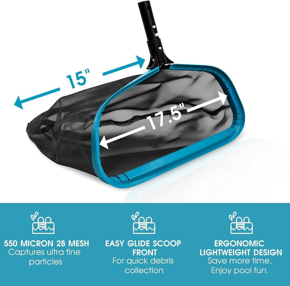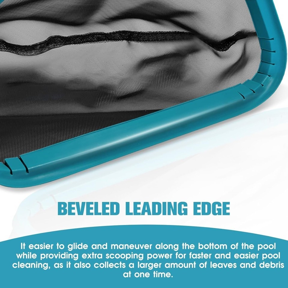 Large Capacity: swimming pool net has a 17 *? opening with " in depth. angled front lip helps scooping out debris efficiently. The wide opening makes it easy to collect larger floating stuff and to skim more impurities at once. Smooth plastic edges will not scratch the pool liner. The deep mesh pocket help accumulating more impurities without frequent dumping, saving even more effort.