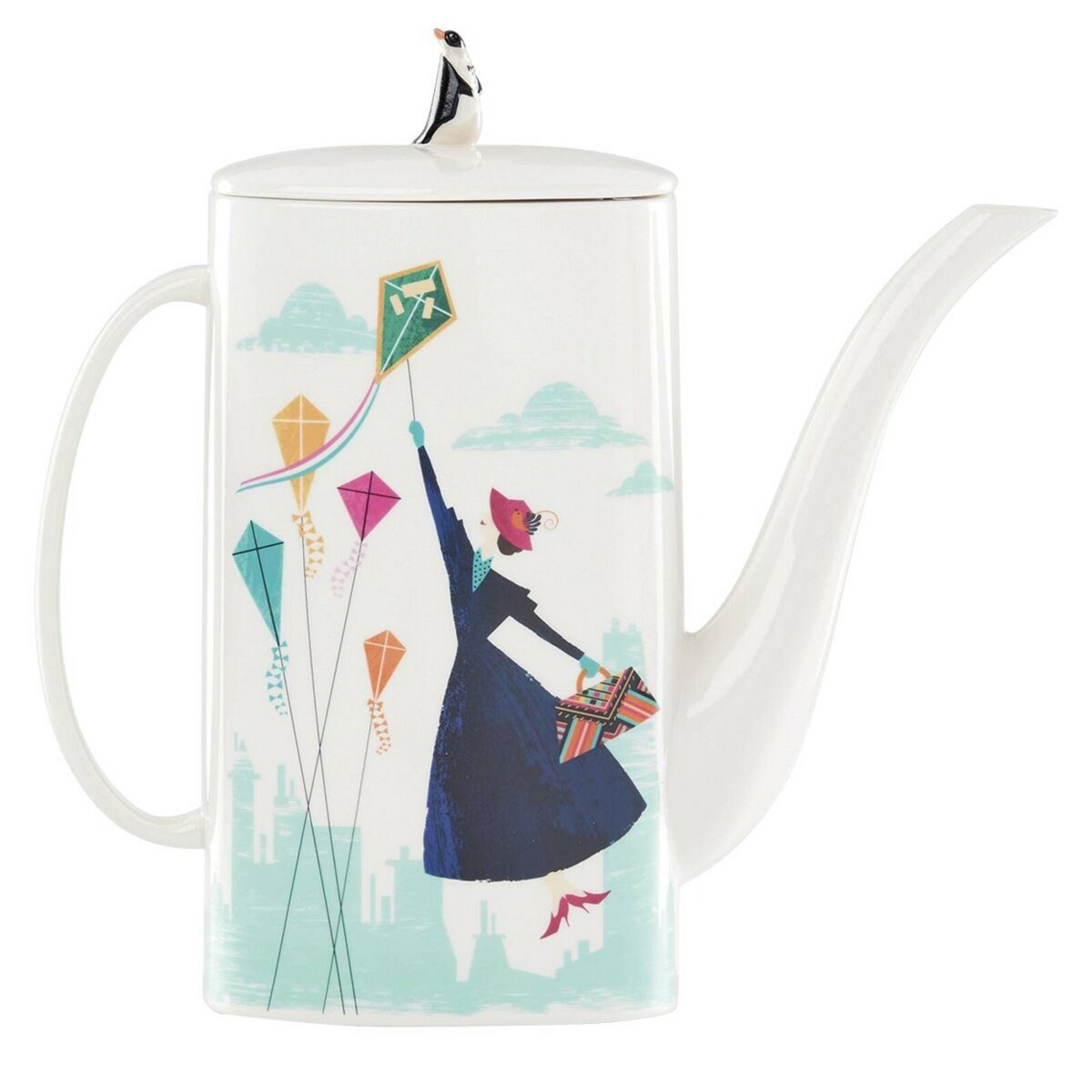 Celebrate the return of everyone's favorite nanny with the Disney's Mary Poppins Returns Teapot. Mary Poppins Returns is a movie sequel to the 1964 classic. This item is crafted of durable and pristine white ceramic porcelain, and features a charming kite and umbrella motive along the sides.