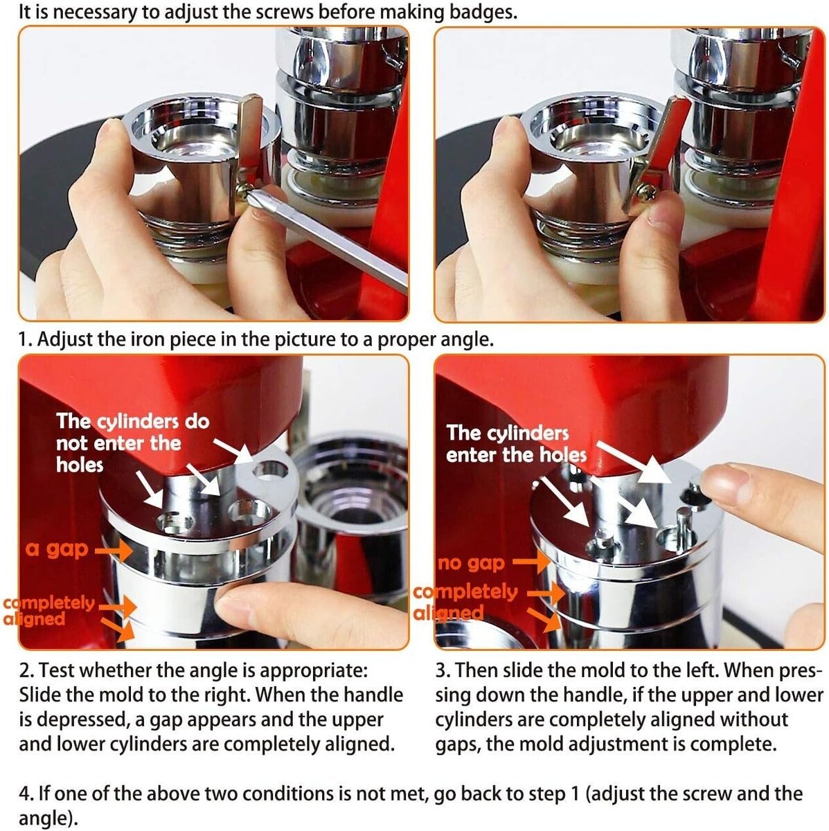 NOTE: If you get stuck during the making of the button, use a wrench to adjust the position of the mold so that the upper and lower molds are completely aligned after pressing the handle. Please refer to pictures or videos.