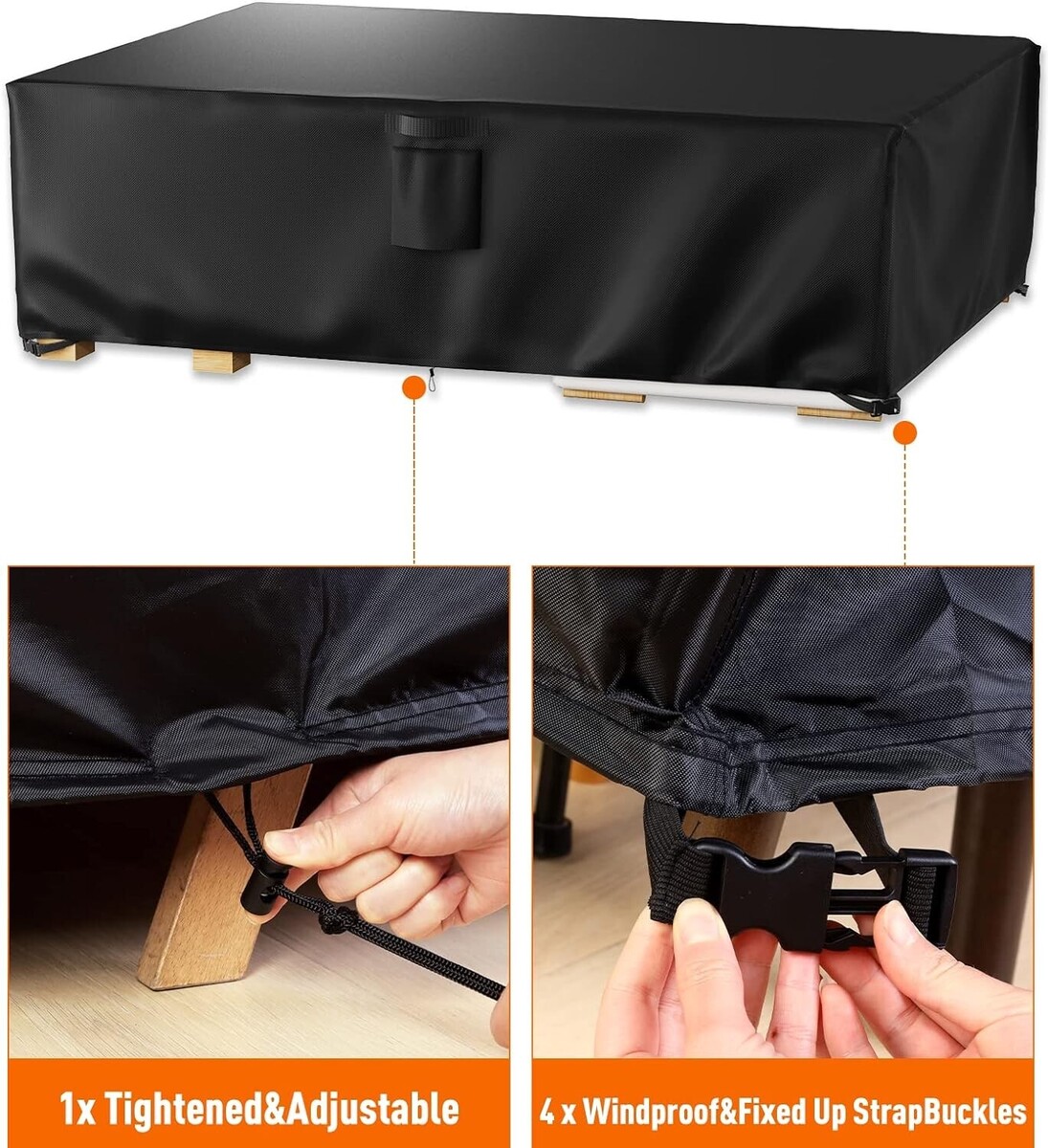 ?Tear and UV Resistant?We developed a high quality patio furniture cover with 600D material strictly stitched and PU coated with waterproof tape at the seams. Keeps your furniture dry. It also protects your furniture from rain, snowstorm, dust, falling leaves, scratches.