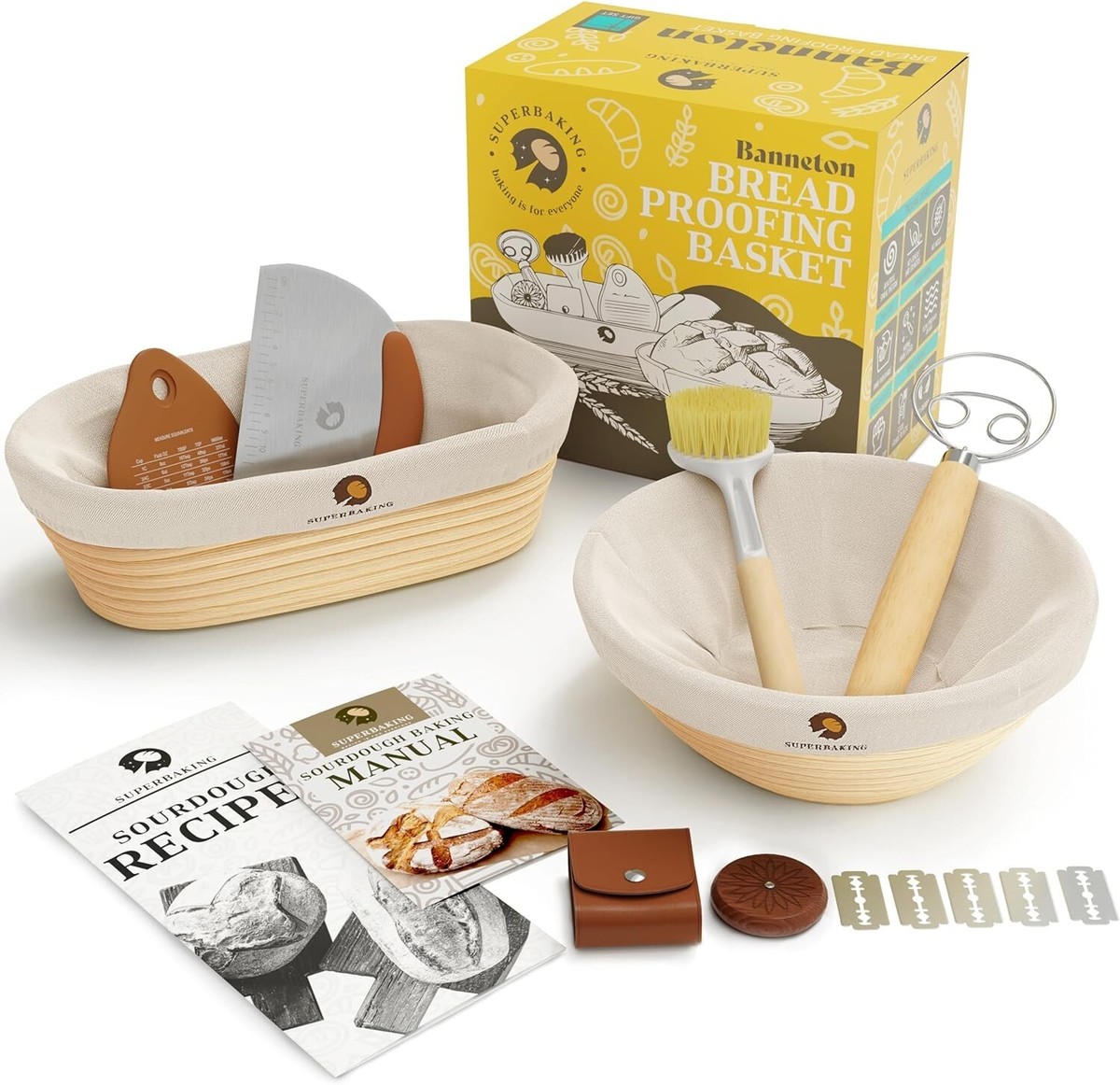 Sourdough Proofing Basket Gift Set, Round 9" Oval 10" Banneton, Sourdough Starter Kit, Sourdough Banneton Basket, Banneton Bread Proofing Basket Set of 2, Sourdough Bread Baking Supplies