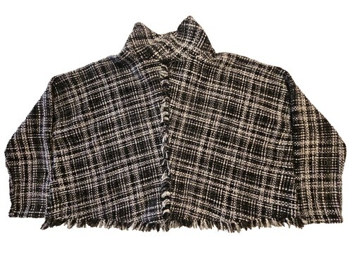Zara Tweed Fringed Top Womens M Black White Plaid Funnel Mock Neck Crop Pullover