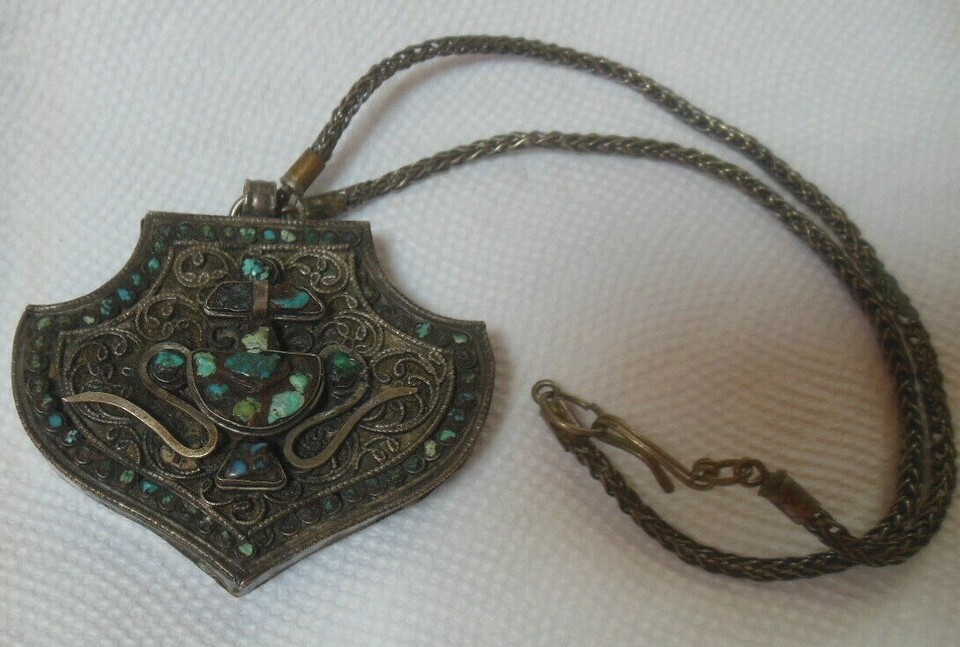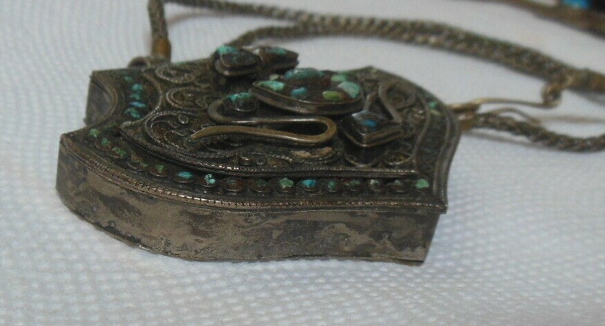 Antique Tibetan Gau Prayer Box Necklace Turquoise Mesh Chain