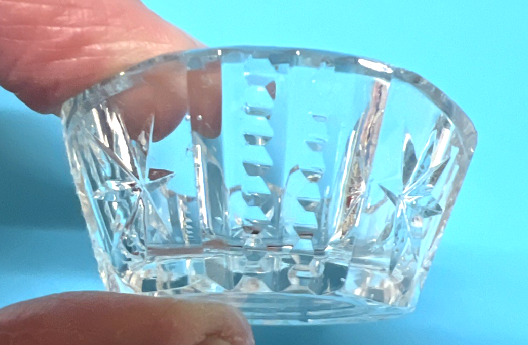 Beautiful Star Cut Crystal Open Salt Dip 1 3/4 x 3/4 inches In Very Good Shape In Good shape it might have a flea bit ...(we needed a magnifier to see those)