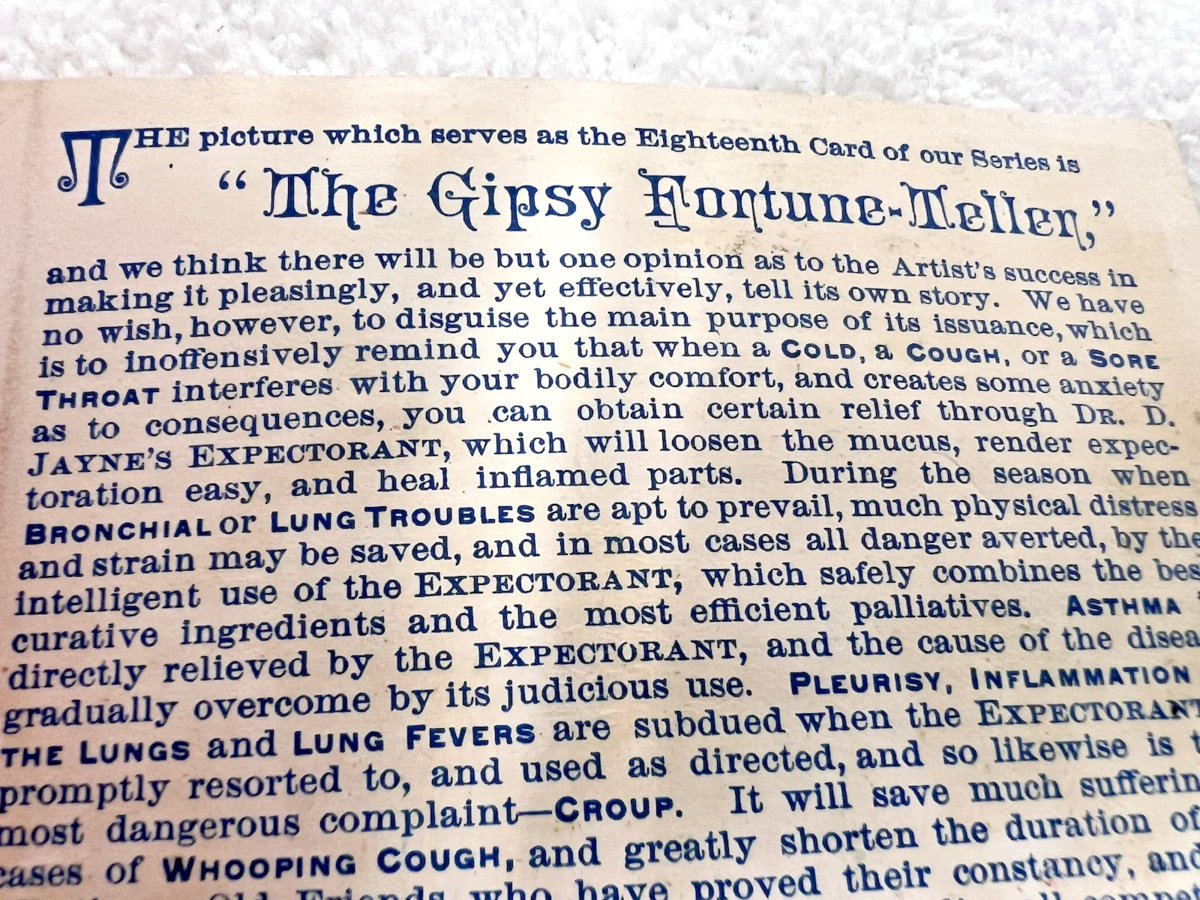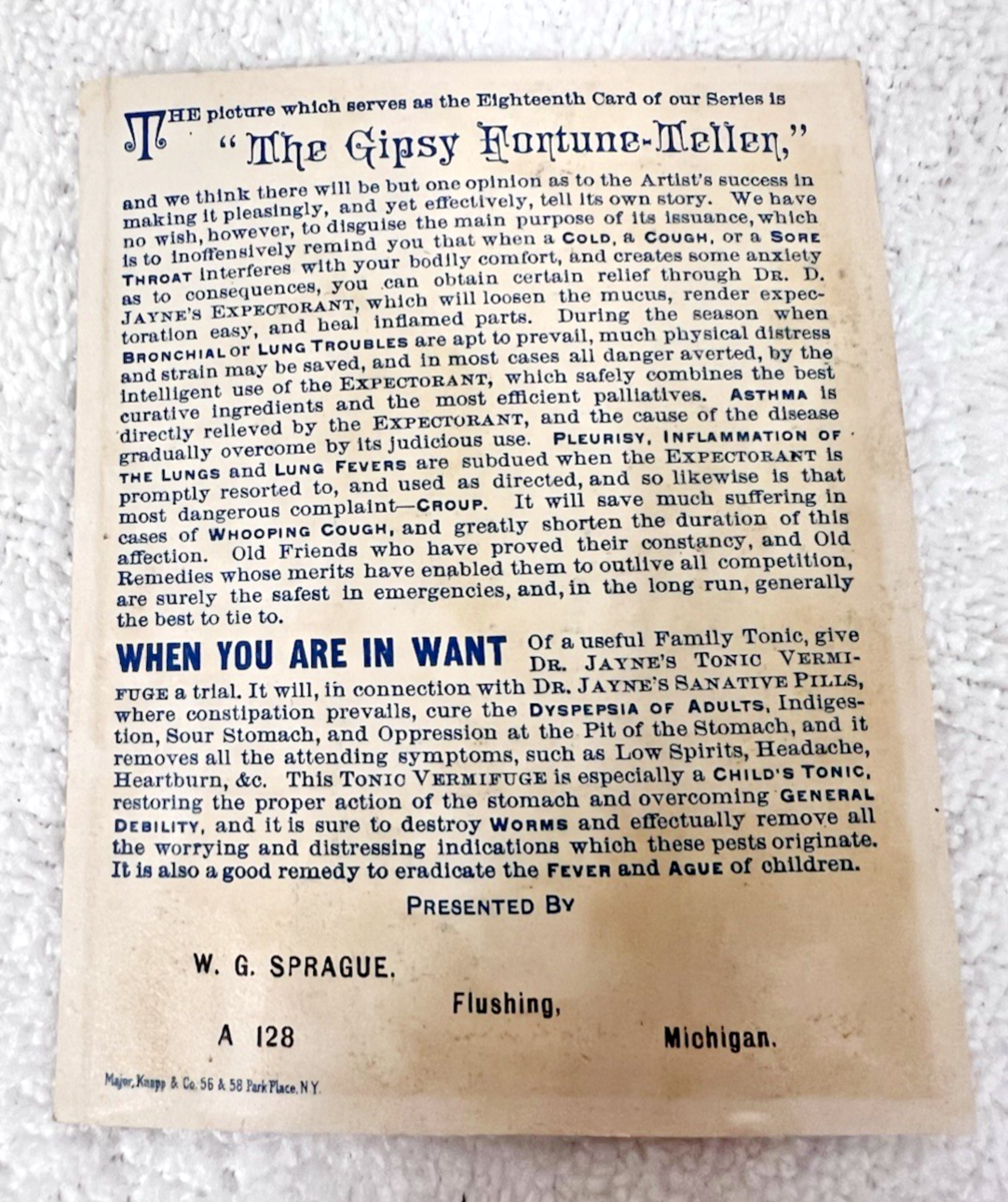 The Gipsy Fortune Teller Gypsy Victorian Trade Card Dr Jayne's Tonic Owl Cat In fair shape but please see the speckled white dots 4 7/8 x 3 7/8 Inches