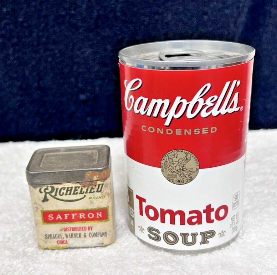 Tiny Richelieu Saffron Spine Tin Paper Over Metal Label Sprague Warner 1 7/8" the label has a few chips and the tin has some rust spots