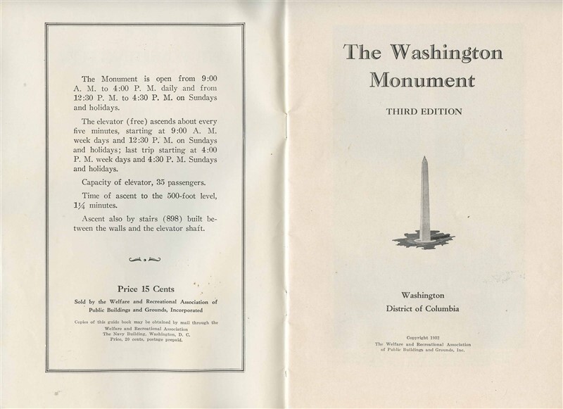 A 32 page booklet. The Washington Monument District of Columbia Booklet 1932, third edition. A detailed illustrated booklet with history, photos, and more on the Monument and grounds.
