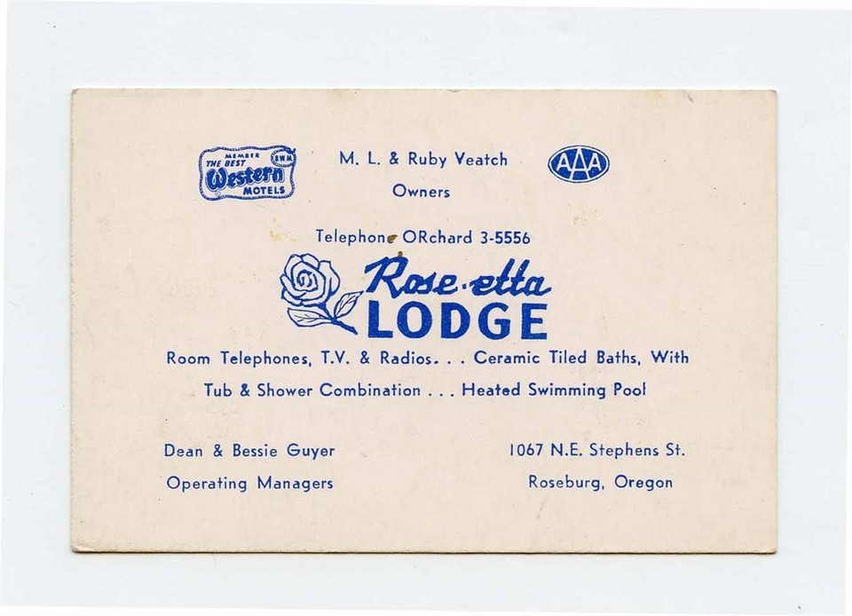 Rose Etta Lodge Business Card Roseburg Oregon 1950's Best Western