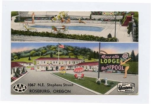 A 2 sided color double image business card. Rose Etta Lodge Business Card . Was located N E Stephens in Roseburg Oregon , circa 1950's