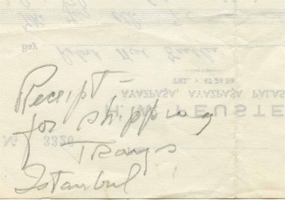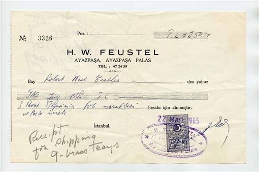 A single page receipt with Hand Canceled and Stamped Turkish Revenue Stamp from the H W Feustel in the Ayazpasa Palace; Circa late 1940's. For the Shipping of 9 Brass Trays.. Measures about 7 5/8" x 5".