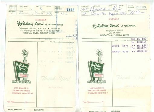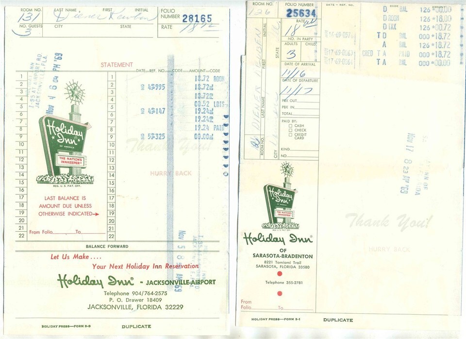 6 Holiday Inn Receipts 1969 Memphis New Orleans Crystal River Sarasota Bradenton