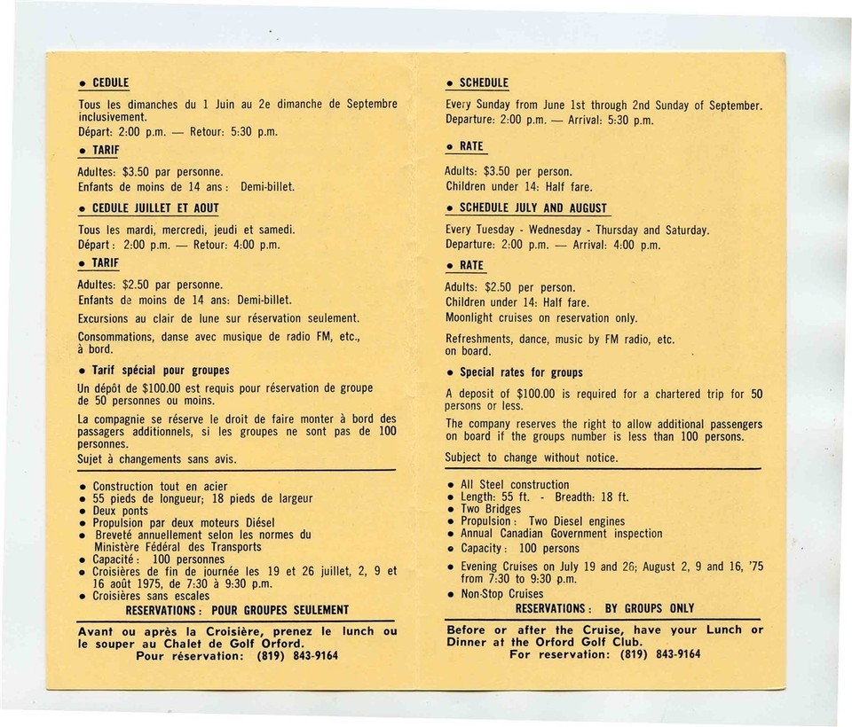 An illustrated 4 panel brochure on heavy stock. M V L'Aventure II Brochure. Take a trip on Lake Memphremagog in Magog Quebec . Lots of information, points of interest, schedule, fares and more. Measures about 3 1/2"x 6" when closed. In French and English