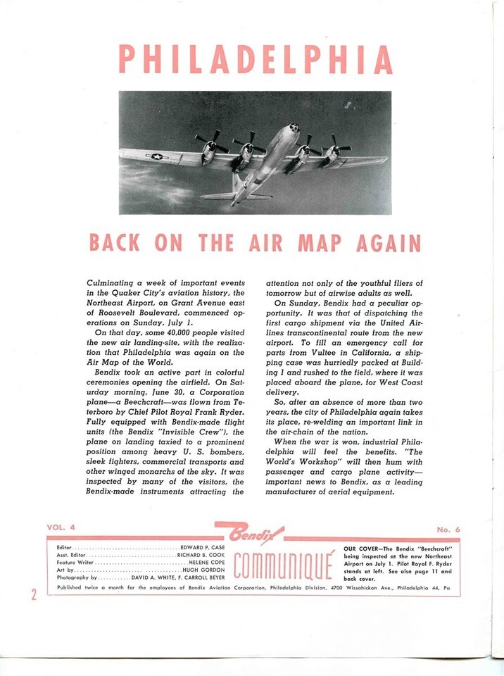 Bendix Communique, Volume 4, Number 6, July 16, 1944. With cover of Bendix Beechcraft B-26 and feature article on the Philadelphia Northeast Airport . Plus lots of company and employee photos and information