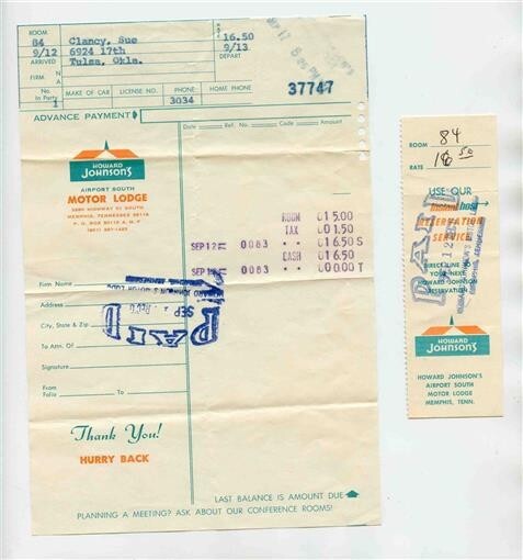 Howard Johnson Airport South Motor Lodge Memphis Tennessee 1971 Bill & Receipt