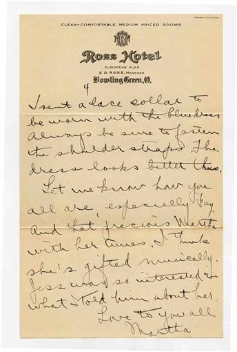 A single Page Handwritten Letter on Ross Hotel Bowling Green Ohio Letterhead, circa 1920's. Page measures about 5 7/8" x 9 5/8" and the back is blank. .
