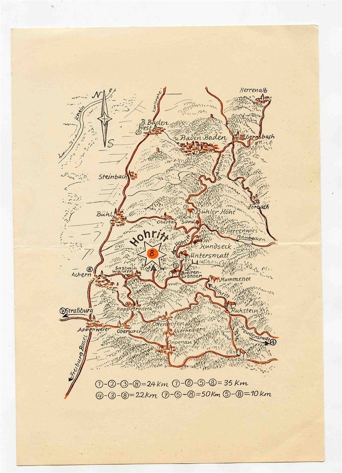 A 2 sided card with area map on one side and drawing of the Hotel on the other side. Measures about 5 7/8" x 8 1/4". In German, circa 1950's. Sternen Wirtshaus Hohritt Gaststuben Sasbachwalden Germany Ad Card Map