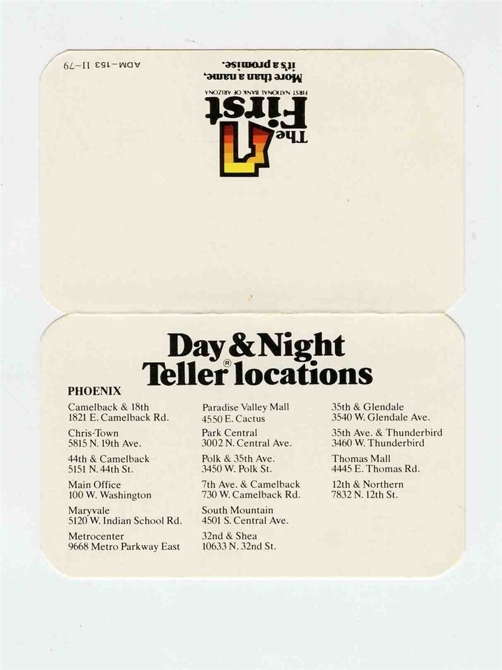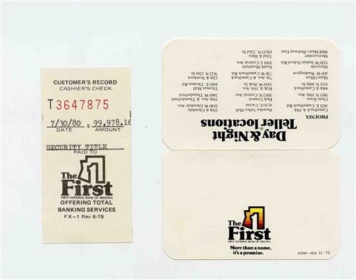 First National Bank of Arizona Business Card and $99,978.16 Deposit Slip 1980