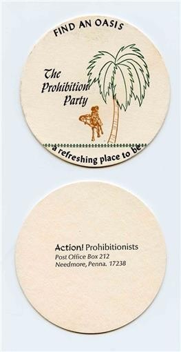 A 2 sided The Prohibition Party Find an Oasis A Refreshing Place to Be Paper Coaster . On the back is the address of the Action!Prohibitionists in Needmore Pennsylvania