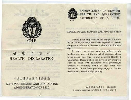 A 4 page Health Declaration form for the Peoples Republic of China . HAs been filled in. In Chinese and English. Measures about 4" x 6" when closed.