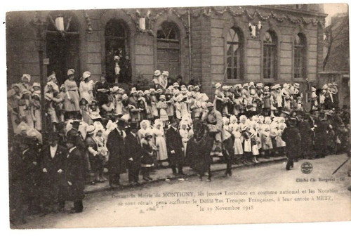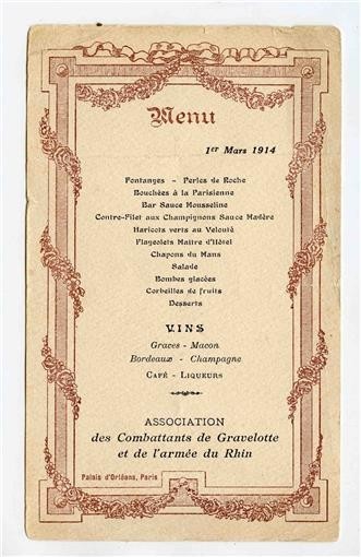 A 2 sided single page menu with name written on the back. Association of Fighters of Gravelotte and the Army of the Rhine dinner menu at the Palais d'Orleans in Paric France on March 1, 1914 Measures about 3 3/4" x 6 1/4".