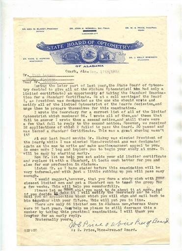 An original single page letter with blank back. State Board of Optometry of Alabama Signed Letter 1938