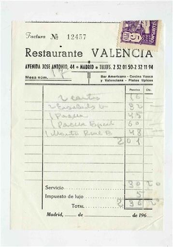 A Restaurante Valencia Guest Check . Located on Avenida Jose Antonio in Madrid Spain. Has Turismo Stamp , circa 1960s'