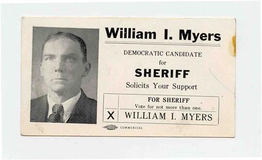 A William I Myers Democratic Candidate for Sheriff Card. Measures about 2 1/4" 4" with a blank back . Location unknown