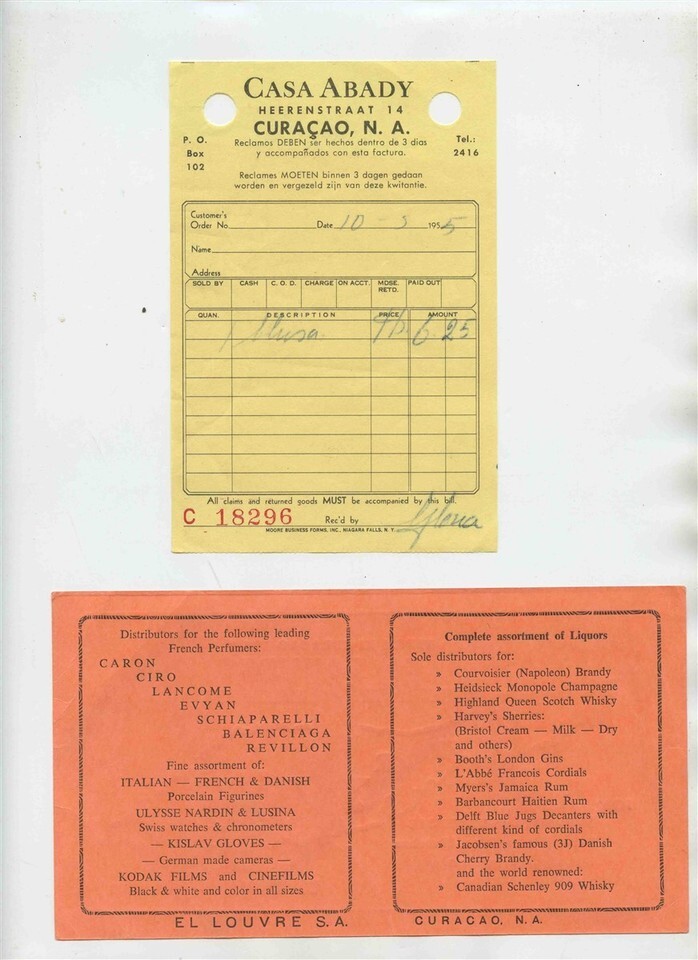 Curacao N A Advertising and Receipts 1955 Cashmere Sweaters Perfume Liquor
