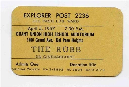 A ticket to see THE ROBE at Grant Union High School Auditorium on Grand Ave in Del Paso Heights in Sacrament California on April 5, 1957. Sponsored by Explorer Post 2236 Del Paso LDS Ward . Measures about 3 1/4" x 2" with a blank back.