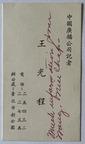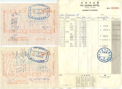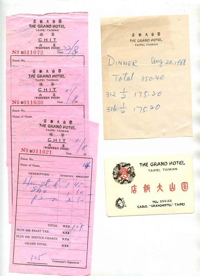 There are 8 items in this lot from . The Grand Hotel in Taipei Taiwan. There is an Account Statement for a 2 night stay in 1968, a 2 sided Business Card, 3 Chits for western Food, and 3 other Receipts. 1968